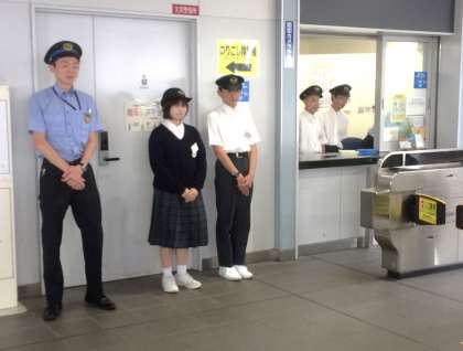 (上)「JR八尾駅」電車が到着するとお客さんが改札口へ。「ご利用ありがとうございます」。しっかり声掛けをしていました。制帽がかっこいいですね。鉄ちゃんにはたまらない体験です。