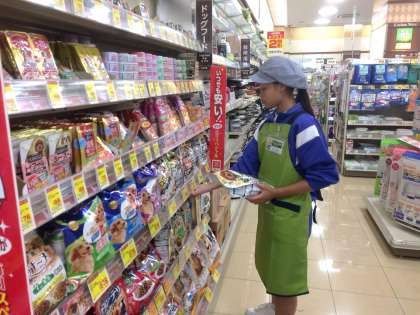 (中)「ライフ久宝寺駅前店」商品の補充をしています。ペットフードも種類が多く、商品を間違えないで見やすく並べます。
