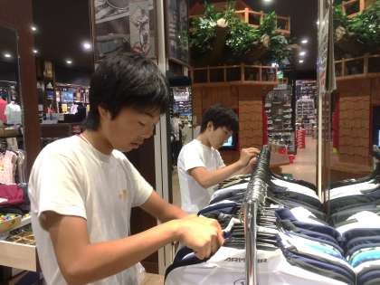 (下)「スーパースポーツゼビオスポーツタウン久宝寺店」Tシャツを袋から出して、ハンガーにかけてサイズタグをつけます。男性用は「S・M・L・LL」そのままですが、女性用は「S=7号。M=9号、L=11号、LL=13号」のタグをつけます。間違えないように!