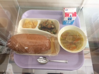 今日の給食は、カレードリア、キャベツのスープ、白桃に大きなごまパンとハチミツでした。