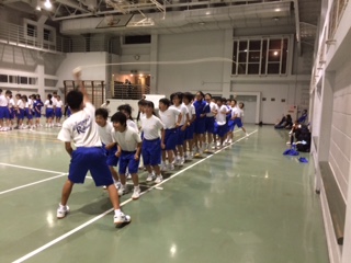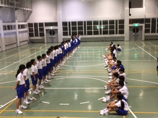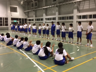 クラス全員でチームジャンプに挑戦する前に、学級歌の合唱でエール交換。