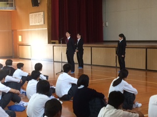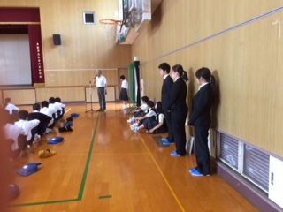 9日(金)、今日で3週間の教育実習が終わるので臨時全校集会を行い、3人の実習生が一人ずつ、あいさつをし3週間の実習への思いを語ってくれました。