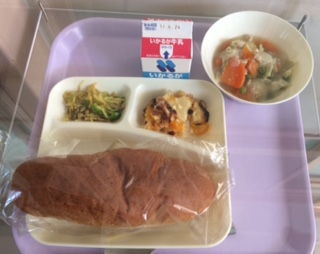 鶏肉と野菜のスープ煮、豚肉ともやし・ピーマンのカレーソテー、ミックスフルーツのクラフティにライ麦パンと牛乳でした。