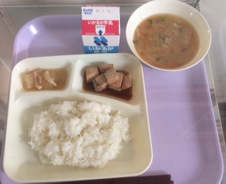 さけのさんしょう風味焼き、今が旬のとうがんの煮物、具沢山のみそ汁。それに牛乳がつきます。