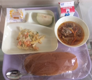 えびグラタン、トマトスープと旬の二十世紀梨にオレンジマーマレードと大コッペパンです。
