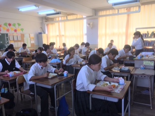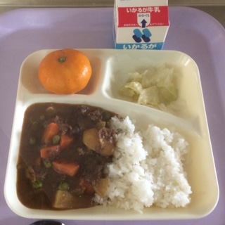 今日の給食はビーフカレーライスです。キャベツのピクルスと冷凍みかんがつきました。