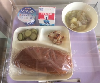 鶏肉のマリネ焼き、スープ煮、きゅうりのピクルスと大コッペパン、ヨーグルト、牛乳です。