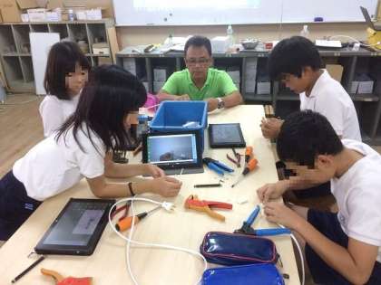 (下)技術科ではテーブルタップづくりをしました。完成した作品はおみやげです。