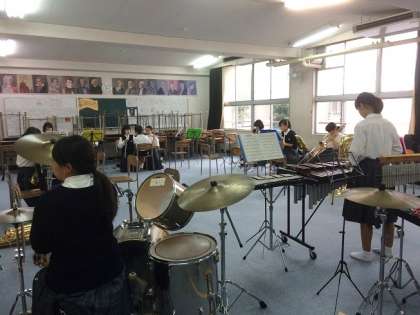 (上)吹奏楽部です。中学生が二人付きっ切りでフルートの吹き方を小学生に教えていましたが、なかなか音を出すのは難しいようです。