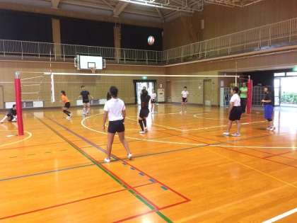 (中)バレーボール部です。アンダーパス、オーバーパスの練習後、コートを挟んでボール回しです。長く続くと拍手!