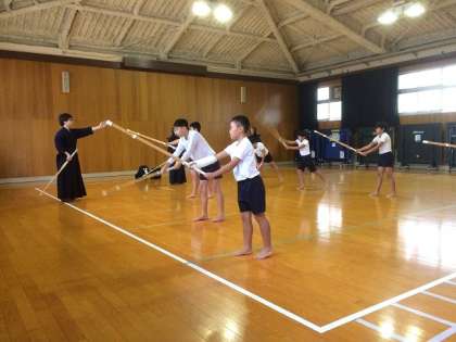 (下)剣道部は武道場で。剣道は礼儀からです。着座、礼の基本から。竹刀を振ると剣道の練習をしている!という感じになりますね。