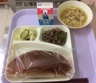 副食は、牛肉のカレー風味焼き、キャベツときゅうりのピクルス、トマトのスープスパゲティです。