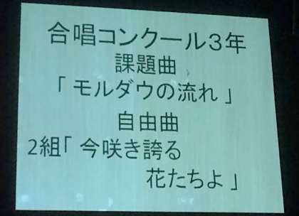 課題曲は「モルダウの流れ」。2組の自由曲は「今咲き誇る花たちよ」です。男子の低音の迫力、女子の美しさハーモニー。男女のソロパートもバッチリです。さすが3年生です。