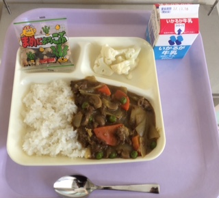 牛肉、じゃがいも、玉ねぎ、にんじん、グリーンピース、セロリの入った、やや甘口のカレーは生徒に大人気です。牛乳もカレーに合いますね。