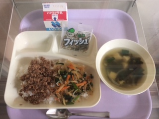 ビビンバ、ワカメと豆腐の中華スープにミニフィッシュがつきました。