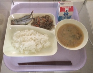 焼きししゃも、きんぴらごぼう、焼きのり、みそ汁にご飯と和食の献立です。