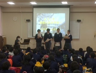 まず、生徒会執行部の生徒が六反中の学校生活をスライドショーで説明。5年生は興味深そうに聞いてくれました。
