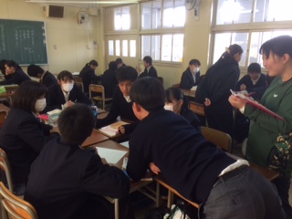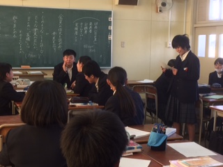 「友情」をテーマに各自が作文を書いて班内で交流します。班内で意見を出し合い、まとめて発表です。比喩を使ったり、発表の仕方も工夫していました。「友情は炎」だという熱い発表もありました。
