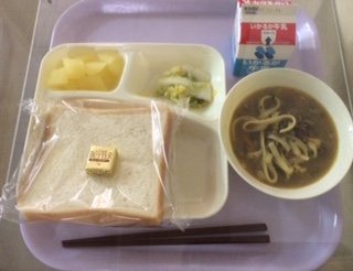 今日の給食は、カレーうどんと食パン2枚、バターに白菜の甘酢あえです。
