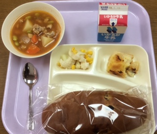 鶏肉と野菜のケチャップ煮、カリフラワーとコーンのサラダ、桃のグラフティにレーズンパンです。