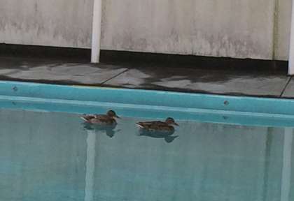 先週の寒さがウソのような暖かい朝。プールには二羽の鴨が仲良く浮かんでいました。
