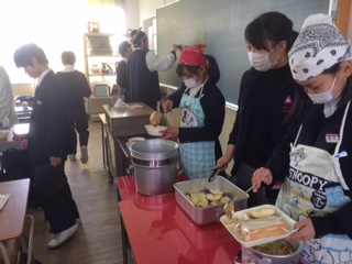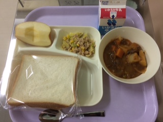 今日の給食は、ビーフシチュー、ツナとキャベツのソテー、りんごと食パン2枚です。