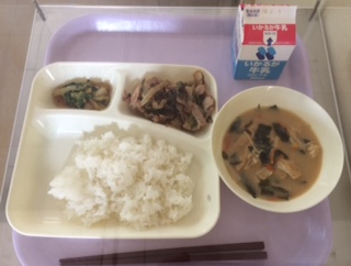 おかずは、豚肉のごまだれ焼き、きくなとはくさいのおひたし、みそ汁です。