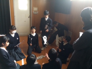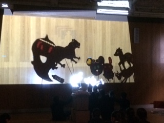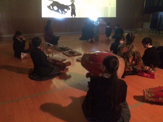 前の時間に作った人形に光をあてて影絵芝居です。民族楽器による伴奏が入ればワヤンの雰囲気になりました。