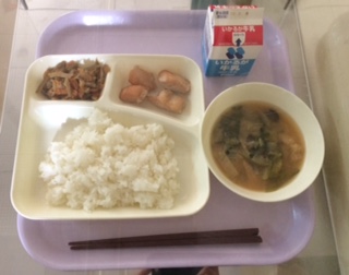 おかずは、鶏肉のしょうゆバター焼き、きんぴらごぼう、みそ汁です。