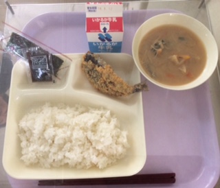 おかずは、いわしのフライ、焼きのり、みそ汁です。