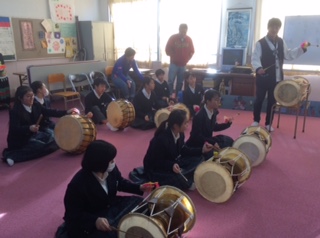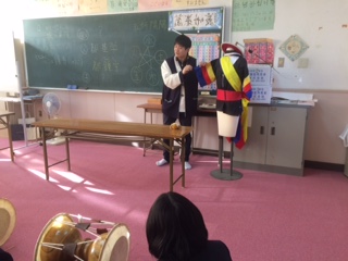 民族楽器の紹介の後は演奏です。リズム感よくチャングなどをたたき、合奏ができました。