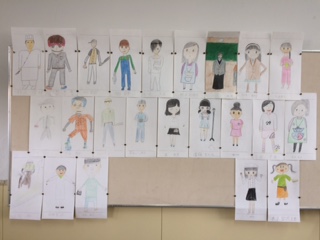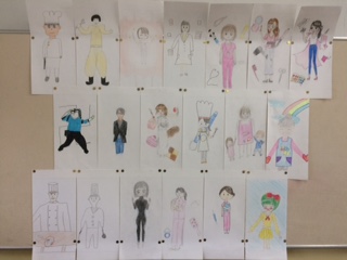 その中で、それぞれが調べた職業に就いている自分を絵で表現。それを学級写真風に掲示してみました。