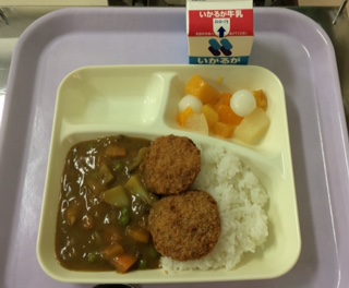 入学祝い献立のカツカレーです。フルーツ白玉もつきました。