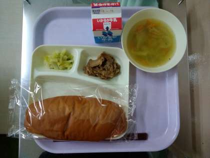 副菜は、豚肉のデミグラスソース、キャベツとピーマンのソテー、スープ。そして牛乳です。