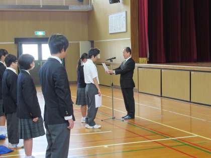 最初に2・3年生の学級委員の認証式を行い、代表で3年1組の男女学級委員に認証状を渡しました。