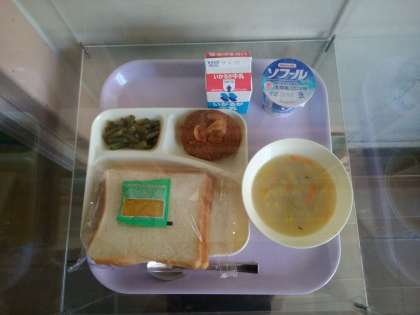 煮込みハンバーグ、コーンスープ、三度豆のサラダ、ヨーグルト、食パン2枚にリンゴジャム、牛乳です。