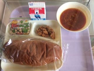 一口トンカツ、ミネストローネ、豆こんぶ、黒糖パン(大)と牛乳です。