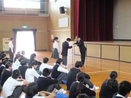 まず、1年生の学級委員認証式を行いました。これで全学年の委員がそろい、今日の放課後には生徒各委員会あります。2・3年生はしっかりリードしてください。