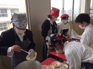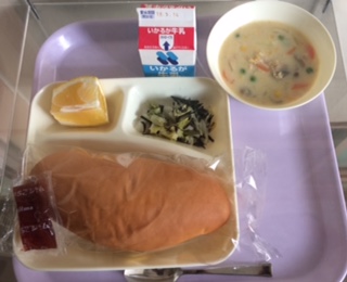 コーンクリームシチュー、キャベツのひじきドレッシング、河内ばんかんと大コッペパン、いちごジャムに牛乳です。