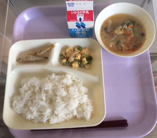 おかずは、きびなごの天ぷら、えんどうの卵とじ、みそ汁。もちろん牛乳も付きます。