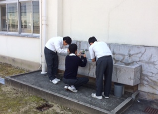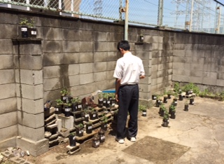 昼休みの校舎裏ではペットボトルプランターのミニトマトの世話をする3年生の姿が。