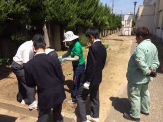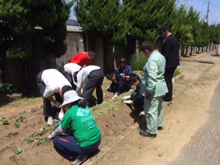 ひまわり学級の生徒が、元気アップコーディネーターと管理作業員さんの指導で、サツマイモの苗を植えました。