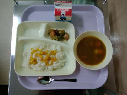 今日の給食は、とうもろこしごはんに、スープカレー、さけのちゃんちゃん焼き、そして牛乳です。