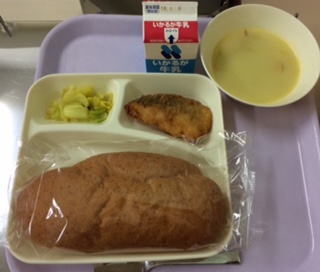 サーモンフライ、キャベツのカレーソテー、豆乳コーンスープに大ライ麦パン、牛乳です。