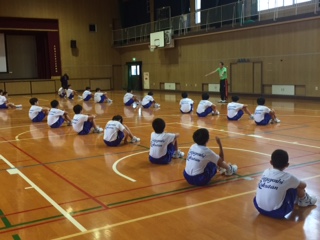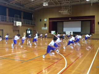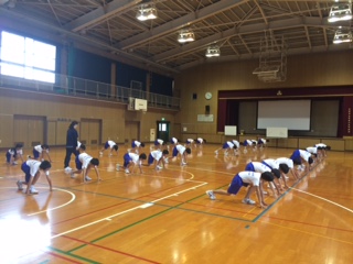 男女共修で、陸上競技のクラウティングスタートの練習です。