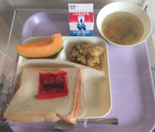 カレードリア、スープ、クィンシーメロン、食パン、イチゴジャムと牛乳です。