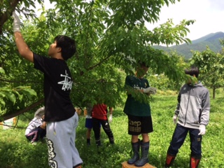 スモモの摘果作業をしています。色が赤くなったり傷のついた実をとり、大きく質の良い実をつけるようにします。
