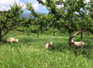 放し飼いの羊は安全な作物を保証しています。草を食べたり、糞尿が肥料になったり、有機循環農法ですね。