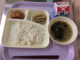おかずは、いわしの天ぷら、厚あげのしょうがじゅうゆかけ、五目汁。