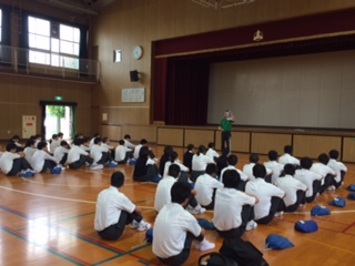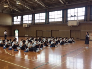 3年生は体育館。今日も8時25分には集合し、学年委員長の号令で整列、集会が始まりました。